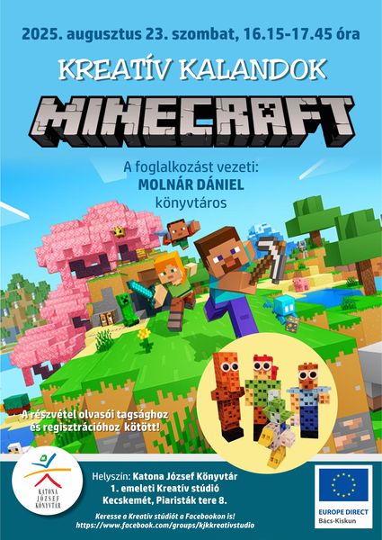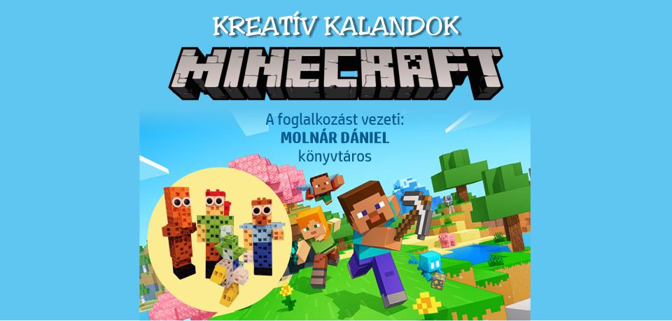MINECRAFT Kreatív kalandok Robotépítés és VR-élmények. A foglalkozást vezeti: Molnár Dániel könyvtáros. A részvétel olvasói tagsághoz és regisztrációhoz kötött! Keresse a Kreatív stúdiót a Facebookon is!