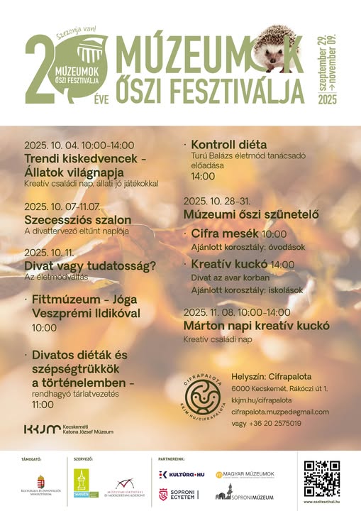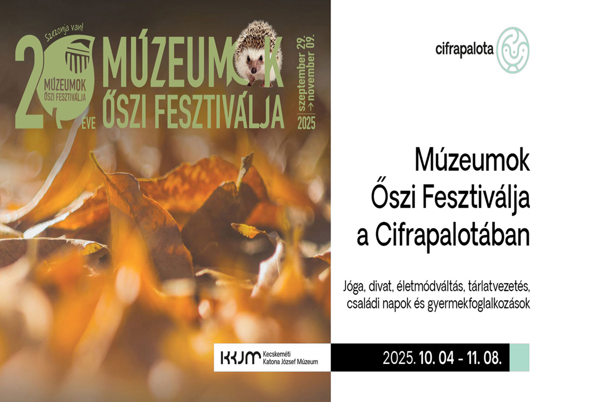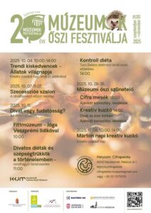 Múzeumok Őszi Fesztiválja a Cifrapalotában![]() 2025.09.29.- 2025.11.09. A Múzeumok Őszi Fesztiváljának idei témája a „Múzeum és divat”, ennek jegyében pedig számtalan izgalmas programmal várják a látogatókat a Cifrapalotában. Az állatok világnapjától kezdve a szecessziós nyomozáson át, a divat és tudatosság témáját körbejáró beszélgetésekig, egészen a mesés őszi szünetig mindenki találhat kedvére való programot. Legyen szó kikapcsolódásról, alkotásról vagy inspiráló beszélgetésekről, nálunk mindenki megtalálhatja a hozzá illő őszi élményt. Programok: október 4. Trendi kiskedvencek. Állatok világnapja október 7 – november 7. Szecessziós szalon. A divattervező eltűnt naplója október 11. Divat vagy tudatosság? Az életmódváltás 10h Jóga Veszprémi Ildikóval október 28-31 között Múzeumi őszi szünetelő 10h Cifra mesék november 8. Márton napi kreatív kuckó Kapcsolódó képek |