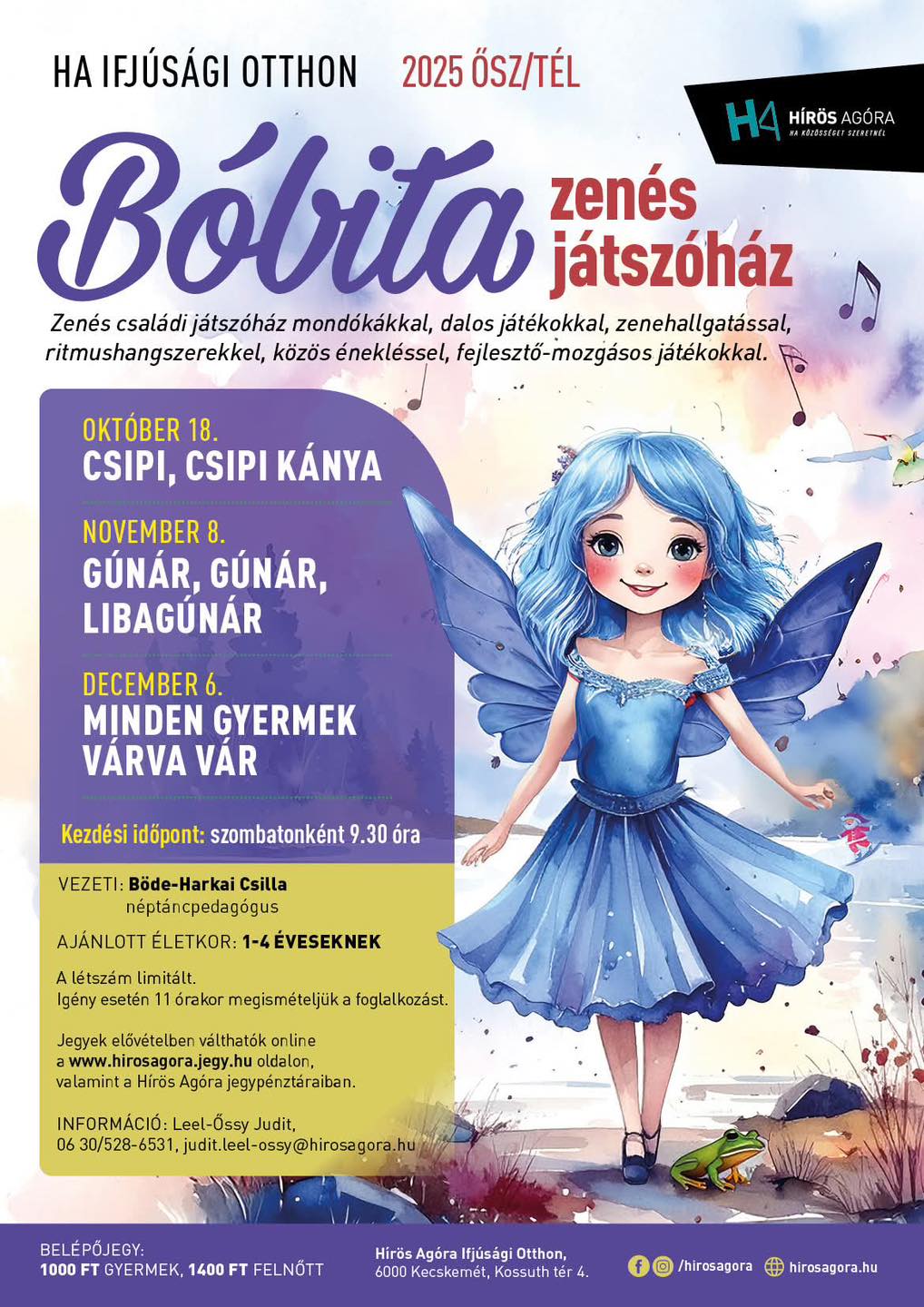 BÓBITA ZENÉS JÁTSZÓHÁZ![]() CSIPI,CSIPI KÁNYA – 2025. október 18., szombat 09:30 Zenés családi játszóház mondókákkal, dalos játékokkal, zenehallgatással, ritmushangszerekkel, közös énekléssel, fejlesztő-mozgásos játékokkal. Ajánlott életkor: 1-4 éveseknek További időpontok: 2025. december 6., szombaton 9.30 – MINDEN GYERMEK VÁRVA VÁR A létszám limitált, belépőjegy: 1.000 Ft gyermekeknek, 1.400 Ft felnőtteknek Vezeti: Böde-Harkai Csilla néptáncpedagógus Igény esetén 11 órakor megismételjük a foglalkozást. Információ: Leel-Őssy Judit, 06 30/528-6531, judit.leel-ossy@hirosagora.hu Forrás: Hírös Agóra Kulturális és Ifjúsági Központ Nonprofit Kft. Kapcsolódó képek |