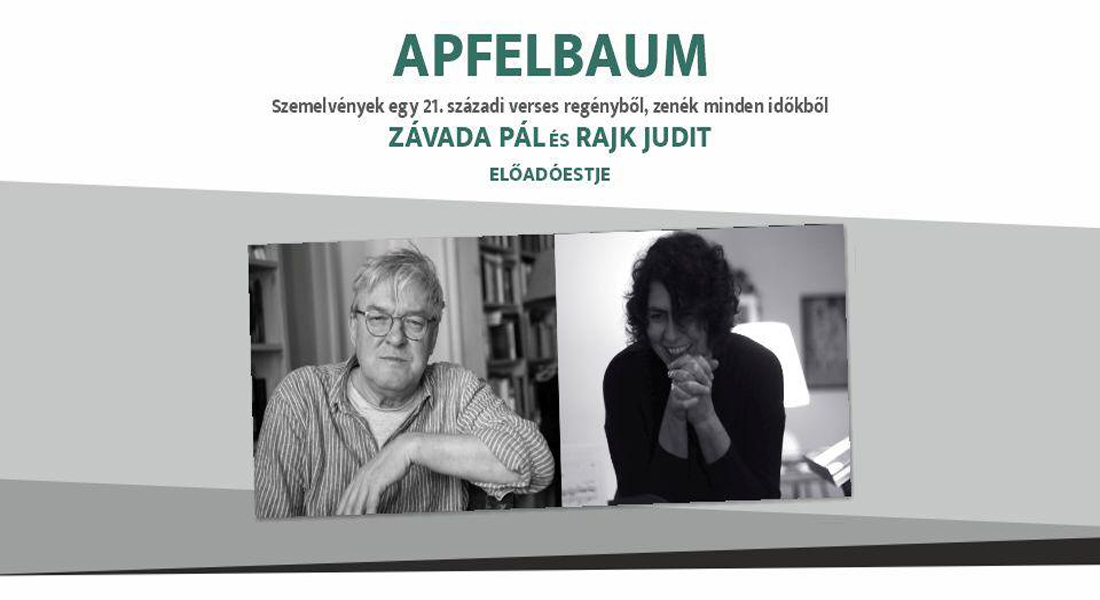 APFELBAUM Szemelvények egy 21. századi verses regényből, zenék minden időkről. Závada Pál és Rajk Judit előadóestje. „Závada Pál és Rajk Judit közös előadóestjén az író 2022 tavaszán megjelent regényéből hangzanak el részletek a szerző előadásában, melyhez a két művész közösen válogatott vokális közzenéket. Facebook-esemény: https://www.facebook.com/events/1965695257610605