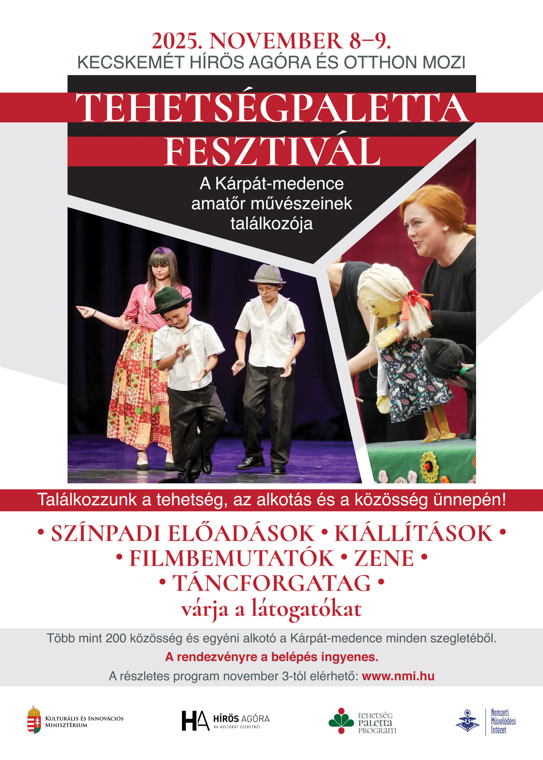 TehetségPaletta Fesztivál a Hírös Agórában! A Kárpát-medence amatőr művészeinek találkozója Kecskeméten, a Hírös Agóra Kulturális Központban! Időpont: 2025. november 8-9. Helyszín: Hírös Agóra Kulturális Központ, HA Otthon Mozi Kecskemét Több mint 200 közösség és egyéni alkotó érkezik a Kárpát-medence minden szegletéből, hogy együtt ünnepeljék a tehetséget, az alkotóerőt és a kulturális sokszínűséget. TehetségPaletta – a magyar kulturális élet egyik leginspirálóbb eseménye! Mindenkit szeretettel várnak! Szervező: Nemzeti Művelődési Intézet, partnerségben a Hírös Agórával A részletes program november 3-tól elérhető: www.nmi.hu