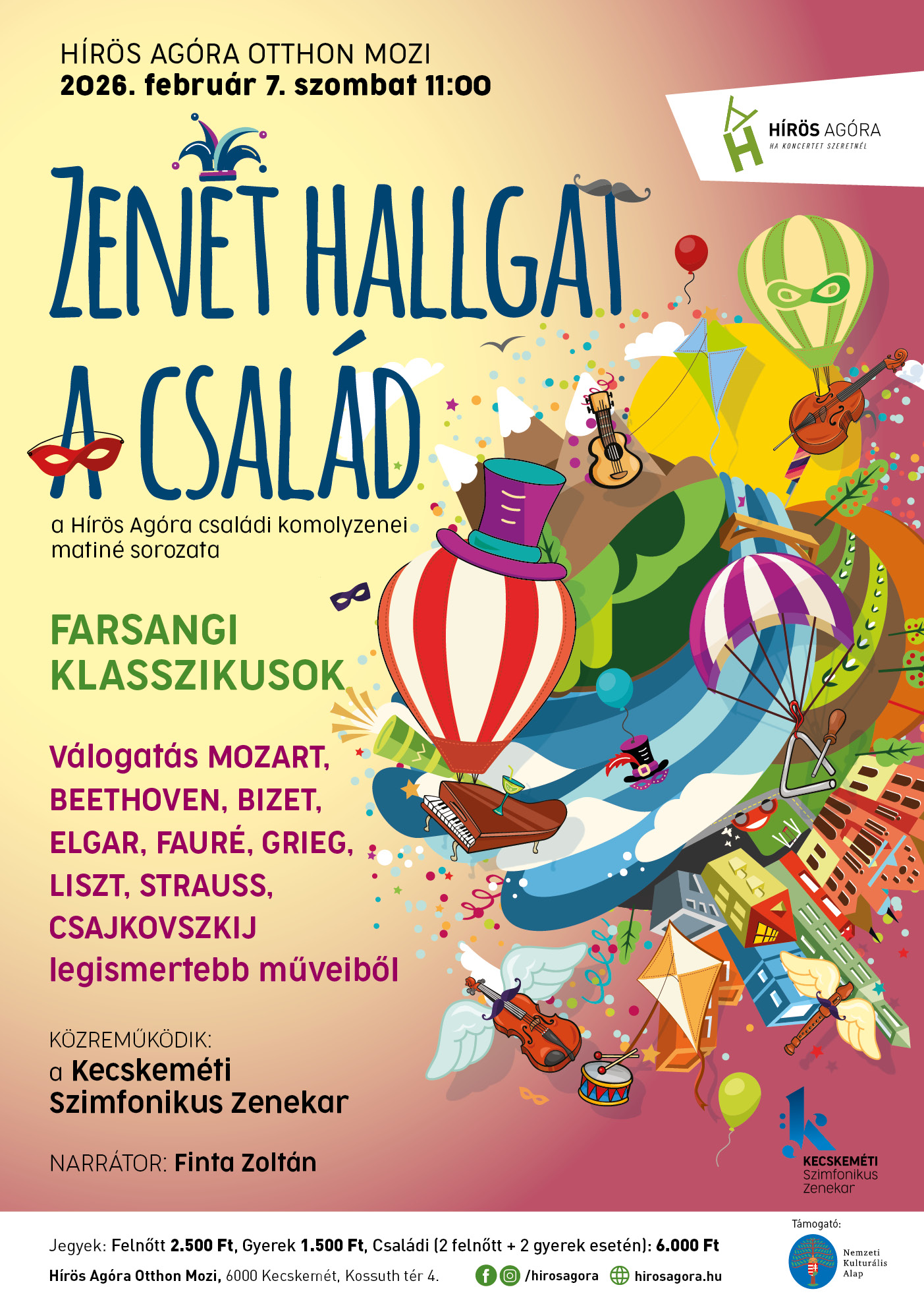 ZENÉT HALLGAT A CSALÁD – FARSANGI KLASSZIKUSOK Öltözzetek jelmezbe vagy gyertek álarcban az egész családdal, és az előadás végén egy finom fánkkal jutalmazunk! Időpont: 2026. február 07. 11:00 Helyszín: Hírös Agóra Otthon Mozi Tudtátok, hogy a zenék igazi történeteket mesélnek el hangokkal? Forrás: Hírös Agóra