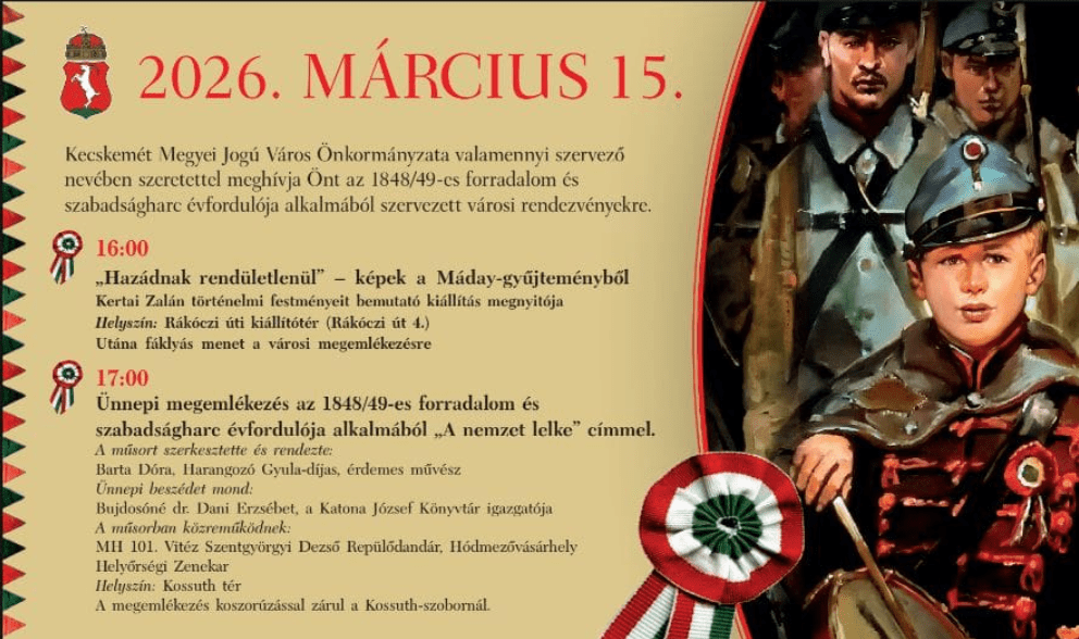 „A nemzet lelke” – ünnepi megemlékezés a Kossuth-szobornál március 15-én. délután. Idén március 15-én rendhagyó módon 17 órakor kezdődik a városi megemlékezés, de ezt megelőzően és az elkövetkező néhány napban is számos program várja az érdeklődőket nemzeti ünnepünk alkalmából. Március 15-én délután 17 órakor „A nemzet lelke” című műsor Barta Dóra Harangozó Gyula-díjas művész rendezésében kerül színpadra. Az 1848/49-es forradalom és szabadságharc évfordulója alkalmából ünnepi beszédet mond Bujdosóné dr. Dani Erzsébet, a Katona József Könyvtár igazgatója. A központi megemlékezésen kívül több helyszínen számos rendezvény várja a közönséget a hét végén és a nemzeti ünnep után egyáránt. Íme a részletes programok! Március 15. 16:00 „Hazádnak rendületlenül” – képek a Máday–gyűjteményből Kertai Zalán történelmi festményeit bemutató kiállítás megnyitója. 17:00 Ünnepi megemlékezés az 1848/49-es forradalom és szabadságharc évfordulója alkalmából ” A nemzet lelke” címmel. A megemlékezés koszorúzással zárul a Kossuth-szobornál. További ünnepi programok: 2026. március 14. 09:00-15:00 Aranyhomok Portéka Piac 10:00-12:00 A Jókai Kirakós és a Hunyadi-hét ünnepi megnyitója Pódiumbeszélgetés (Katona József Könyvtár, Nagyterem) A pódiumbeszélgetésen való részvétel a Jókai Kirakós és a Hunyadi-hét vetélkedőkön való részvételhez kötött. Jelentkezés: jokai.kirakos@gmail.com, hunyadihet@gmail.com Helyszín: Katona József Könyvtár (Piaristák tere 8.) 10:30 Márciusi mese Interaktív táncos-zenés mesejáték a Kackiás Folkszínház előadásában. 13:00 Hagyományőrző családi nap a márciusi ifjak tiszteletére 18:48 18:48 – MÁRCIUSI IFJAK 2026. március 15. 10:00-11:00 Tavaszi madárka 10:00-14:00 Forradalmi kreatív kuckó és kokárdavadászat. Karkötő, fülbevaló és huszár-kokárda készítése. 10:00 „Ezernyolcszáznegyvennyolc, te csillag” 11:00 Aki vitéz, fel a lóra! -Ünnepi családi játszóház 11:15 Drámanap a Katona József Emlékházban 13:45 Ünnepi megemlékezés a Nyíri-erdőben Az ünnepi műsort a Kiskun Huszár és Honvéd Hagyományőr Egyesület és a Kunszentmiklósi Nemzetőrök puskaportól és ágyúdörgéstől hangos, látványos csatabemutatója és a Kecskeméti Városi Fúvószenekar dallamai színesítik. Helyszín: Nyíri-erdő, Szent Hubertus Parkerdő (Kecskemét-Hetényegyháza) 18:00 Most vagy soha! – magyar történelmi kalandfilm 2026. Március 18. 14:00 Amit még nem hallottál a huszárokról „Föl, föl, látjátok lobogómat…” Helyszín: Bozsó Gyűjtemény (Klapka u. 34.) 17 óra A mi Erkelünk – dokumentumfilm-vetítés és pódiumbeszélgetés Ingyenes múzeumpedagógiai foglalkozások a Bozsó Gyűjteményben. Forrás: Hiros.hu
