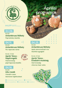 04.11. szombat 10.00 Antanténusz Műhely Kézművesség: filc napocska varrása Az áprilisi kézműves foglalkozáson filc anyagból kivágott napocskákat készíthetnek kicsik és nagyok rozmaringöltéssel. Végül gyönggyel díszíthetik. Az Antanténusz Műhely foglalkozásain a múzeumpedagógusok örömmel várják a gyermekeket, családokat, felnőtteket, alkotni vágyókat. A foglalkozást 10 éves kortól ajánlják. 15.30-17.00 Aprók Tánca – Naphívogató Kézművesség: papírnapocska készítés Az apróságokat hívják a havonta kétszer visszatérő szombat délutáni néptáncos komplex programra. A talpalávalót a Hegedűs Együttes húzza, a táncokat, dalokat, mondókákat és játékokat Nagy Erika és Juhászné Mató Adrienn táncpedagógusok tanítják. Az Aprók Tánca aktuális témája a naphívogató. A tánc és zene mellett ez alkalommal a kézműves műhelyben papírnapocskát lehet készíteni.