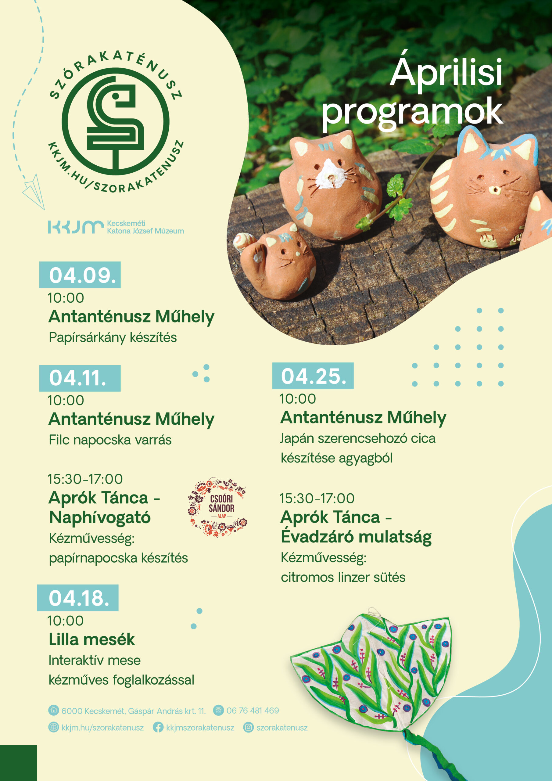04.25. szombat 10.00 Antanténusz Műhely A műhelyben vörös agyagból készíthetnek egyedi macskafigurákat a résztvevők, melyeket földfestékkel is díszíthetnek. A foglalkozáson kiderül, hogy miért is szerencsehozók ezek a cicafigurák. Az Antanténusz Műhely foglalkozásain a múzeumpedagógusok örömmel várják a kis és nagy gyermekeket, családokat, felnőtteket, alkotni vágyó embereket. A program korhatár nélkül látogatható. 15.30-17.00 Aprók Tánca – Évadzáró mulatság Kézművesség: citromos linzer sütés Ebben a félévben az utolsó Aprók Tánca programra várják az apróságokat. Ez alkalomból fergeteges táncmulatsággal és citromos linzer sütéssel készülnek a munkatársak. A mulatsághoz a Hegedűs Együttes húzza a talpalávalót, Nagy Erika táncpedagógus és Juhászné Mató Adrienn tanítják a résztvevőket a néptánclépésekre.